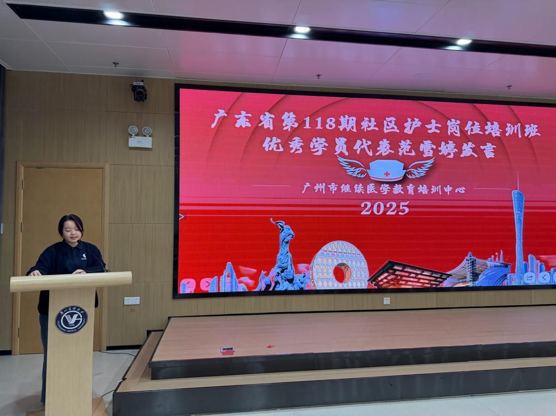 优秀学员代表范雪婷发言,她代表全体学员表达了对中心和老师的感谢,并表示社区护士岗位培训不仅是一次专业技能的提升,更是一次对全科护理深入理解的旅程。全科护理,它不仅仅关注疾病的治疗,更强调人的整体性健康。在这个过程中,学会了如何从生理、心理、社会等多角度全面评估居民的健康状况,为他们提供个性化的护理服务。